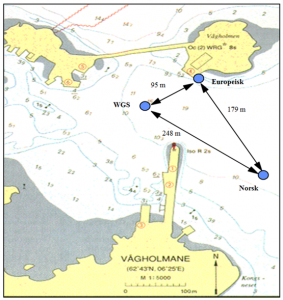 Illustrasjon av avstanden mellom tre datum på et gitt sted (geografiske koordinater). (Illustrasjon: Navigasjon for maritime studier)