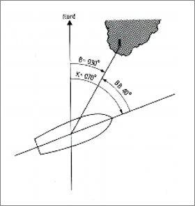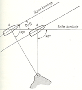 Fyret er tvers i A, mens vi passerer fyret i B. Peilingslinjens vinkel med den rettvisende seilte kurslinje er da 090º. (Ill.: H. Fjeld)