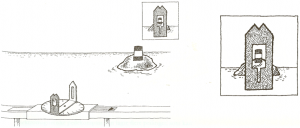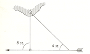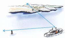 Firestrekspeiling – Vi peiler f.eks. et fyr 4 streker (45°) på baugen, og deretter når vi har det tvers, dvs. 8 streker (90°) på baugen. Avstanden til fyret når det peiles tvers, er lik den utseilte distansen. (Ill.: H. Fjeld)