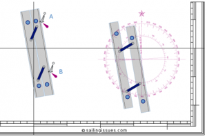 Her tenker vi oss at vi skal fra A til B. Vi setter ut en kursstrek fra avf pl til påk pl, parallellforskyver denne til origo i nærmeste kartrose, og leser av Rv k på den ytre rettvisende kompassrosen. (Illustrasjon: Sailingissues.com)