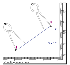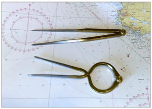 Når vi skal finne distansen mellom to objekter i kartet, går vi til breddeskalaen rett t.h. og setter f.eks. 10 breddemin/n.mil i passeråpningen. I dette tilfellet rekker vi å gå tre passerskritt a 10 n.mil før vi må endre passeråpningen. Restlengden her viser seg å være 7 n.mil, og vi måler distansen til 37 n.mil. Ett breddeminutt = en nautisk mil = 1852 meter. (Illustrasjon: Sailingissues.com)