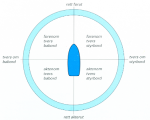 Når vi ikke tar utgangspunkt i himmelretningene, kan vi forholde oss til fartøyets langskipsretning. Relative retninger er da rett forut, rett akterut, tvers om styrbord, tvers om babord, forenom tvers styrbord, forenom tvers babord, aktenom tvers styrbord og aktenom tvers babord (se fig). Tvers om styrbord/babord er 90° på langskipsretningen, og forenom/aktenom tvers styrbord/babord er mellom tvers om styrbord/babord og rett forut/akterut.