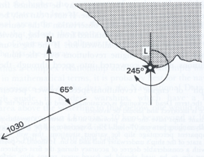Peilingslinjen, Rv 065°, er en stedlinje når den settes ut i kartet fra fyret i 245°, motsatt av den rettvisende peilingen. På fig. settes klokkeslettet kl. 1030 når peilingen foretas.