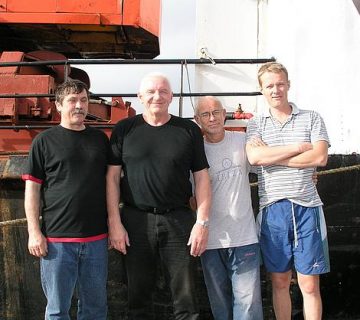 Mats20. november 2020 MS Euro Fjord (tidl. Trolltind), samarbeid over landegrensene. F.v. russisk maskinsjef, norsk skipper, polsk overstyrmann og litauisk matros. Det