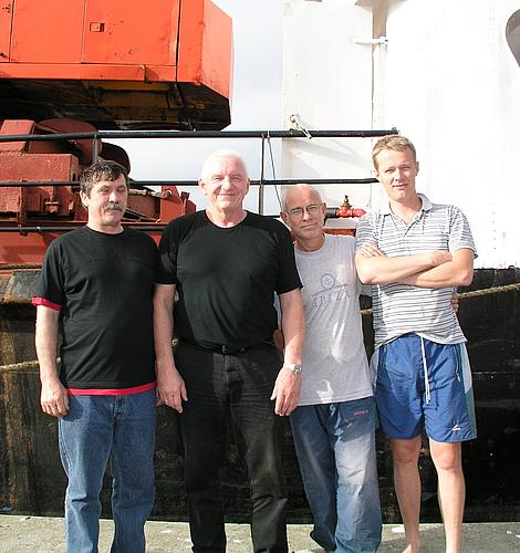 MS Euro Fjord (tidl. Trolltind), samarbeid over landegrensene. F.v. russisk maskinsjef, norsk skipper, polsk overstyrmann og litauisk matros. Det meste ble kommunisert på tysk