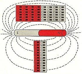 Et magnetisk felt snur doménene i en jernstang, slik at den blir magnetisk. (Johnsen og Bryn 1969)