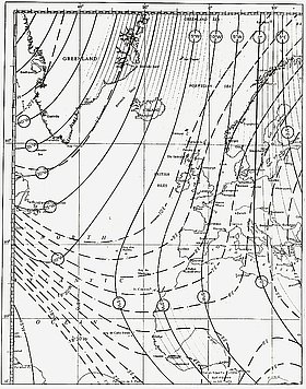 Isogonkart over Nord-atlanteren. De heltrukne linjene viser isogoner, og de stiplede viser årlig forandring av misvisningen. (Utdrag av britisk kart 5374 fra 1975)