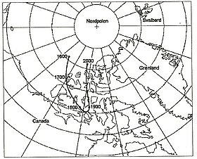 Bevegelsen til den magnetiske nordpol fra år 1600 til år 2000. Ved et naturens lune befant den seg i Nordvestpassasjen, og beveget seg ganske langsomt nettopp under de store ekspedisjoner dit (Ross 1831-32, Amundsen 1903-05).