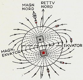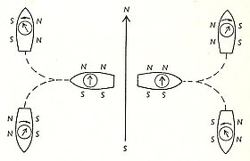 Jordmagnetismens virkning på bløtt jern i skipsskroget. Fig. viser hvordan en loddrett og en vannrett jernstang vil magnetiseres på forskjellige bredder. (Johnsen og Bryn 1969)
