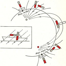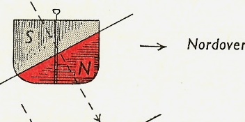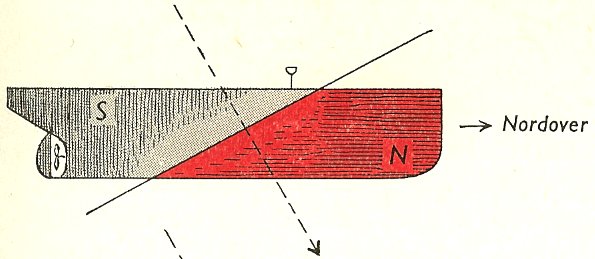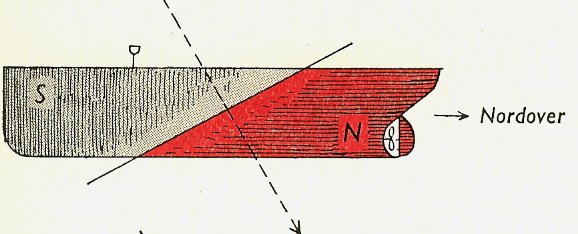 Jordas magnetiske felt induserer magnetisme i skipsskroget. Fartøy bygd på nord magnetisk bredde med stevnen i magnetisk nord (øverst), og fartøy bygd med stevnen i øst (nederst). (Johnsen og Bryn 1969)