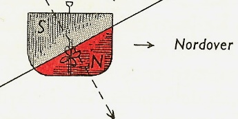 Kompasset har deviasjon når nåla danner en vinkel med den magnetiske meridian. (Johnsen og Bryn 1969)