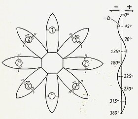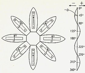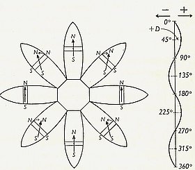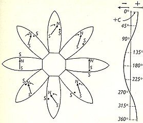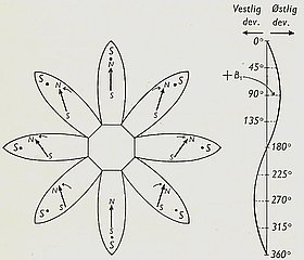 Denne vil gi en lignende deviasjon, men fortegnet vil være motsatt. For kurs øst og vest er stangen umagnetisk, for kurs nord og sør er den sterkest magnetisk, med polene i nålens lengderetning. Deviasjonen er altså null for de fire hovedstrekene.