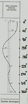 Vi har nå drøftet hvilke deviasjoner de forskjellige typer jern i skipsskroget forårsaker på de enkelte kursene. Når vi skal finne samlet deviasjon, adderer vi alle kurvene. En samlet deviasjon kan se slik ut:
