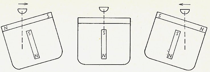 Fig. f.v.: Nord magnetisk bredde, magnetisk ekvator, syd magnetisk bredde. De tre figurene viser hvordan deviasjon, forårsaket av flyktig magnetisme i loddrett jern, forandrer seg med magnetisk bredde. (Johnsen og Bryn 1969)