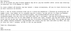Hei, ville bare informere om at jeg ikke lenger går i nautikk-klassen. Derfor blir det ikke noe mer QT på meg. Matte er ikke for alle, synes det er vanskelig allerede nå, og dette er jo bare starten! Derfor velger jeg å slutte. Men må si at jeg synes undervisningsformen din og QT systemet fungerer bra. For det gjør det lettere å øve og finne ut av hva du kan og ikke kan, for så å være bedre rustet til en eventuell eksamen. Og ikke minst, det fanger opp alle de som henger på lasset, slik som undertegnede.