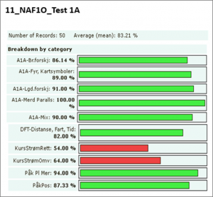 Kravet til bestått er generelt 70 %, oppgaver innen kursrettelser krever 80 % og Rules of the Road, lanterner og signaler krever 90 %. For å få adgang til tentamen i desember og eksamen i mai/juni må alle tester være bestått. Hvis en student ikke består en test gis det ett nytt forsøk. Hvis en student ikke består kontetesten må hele faget tas på nytt.