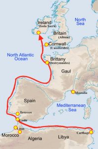 Kartet viser en antatt rute for Himilcos ekspedisjon ca. 525 fvt. Det hersker stor usikkerhet, både mht når reisen skal ha skjedd, men også mht hvor de havnet til slutt. Det spekuleres til og med om ekspedisjonen kan ha blåst vestover inn i Sargassohavet nordøst av Cuba og Bahamas.