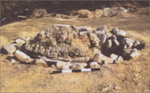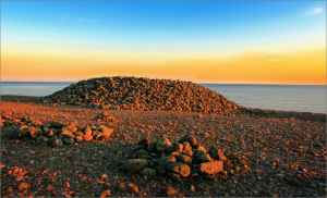Fra ett av gravfeltene på Mølen. Her ser vi rett syd, over en av våre farligste kyststrekninger. Det skyldes bunnforhold med varierende batymetri (sjøbunnens høydeforhold), noe som gir bunnrefraksjon som sender bølgene i alle retninger.