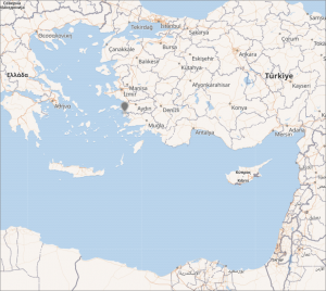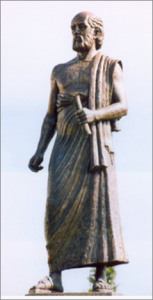 Thales fra Miletus (ca. 624 – 545 fvt.). På kartet t.h. er Miletus (Milet) plassert i Egeerhavet, sør for Izmir og rett nord for Samos.