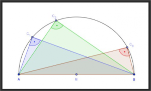 Figuren viser Thales setning: «I trekant ABC er AB diameter i en sirkel med sentrum M, og C ligger på sirkelperiferien. Da er <C = 90°». I klassisk navigasjon er vi storforbrukere av rettvinklede trekanter!