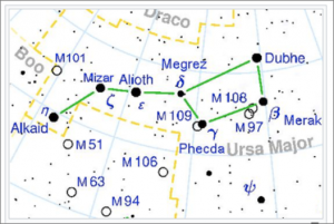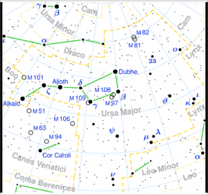 På kartet t.v. ser vi stjernemønsteret (asterismen) Big Dipper, Karlsvogna, som utgjør de syv klareste stjernene i stjernebildet t.h., Ursa Major, Store bjørn (mannsvognen).
