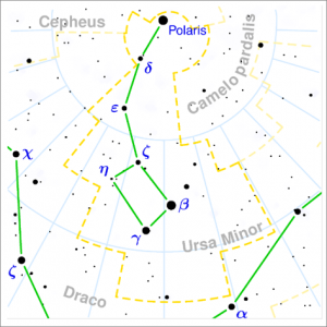 Kartet viser stjernebildet Ursa Minor, Lille bjørn (kvinnevognen), med stjernemønsteret Little Dipper hvor Stella Polaris ligger nær geografisk nord.