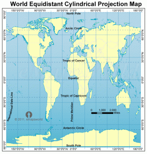Eksempel på dagens utgave av et verdenskart i equidistant cylindrical projection. Vi ser hvordan landområdene i denne sylinderprojeksjonen forstørres mot nord og sør etter hvert som vi fjerner oss fra ekvator.