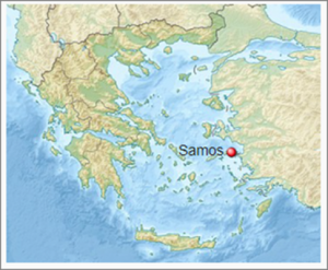 Pythagoras fra Samos (ca. 569-495 fvt.). På kartet t.h. finner vi Samos rett syd for Miletus.