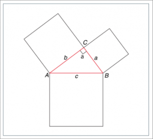 Pytagoras’ teorem: Arealet av det største kvadratet er lik summen av de to andre kvadratene.
