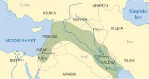Babylonia er kjent for sine byggverk, lovverk, vitenskap, litteratur og kunst. Den stiplede linjen viser det gammelbabylonske riket på Hammurabis tid (1792–1750 fvt.). Det mørkegrønne området viser det nybabylonske riket ca. år 600 fvt. Navn og grenser av i dag er markert med grått.