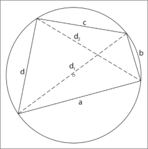 Ptolemaios sats. Produktet av d1 og d2 er lik summen av ac og bd.