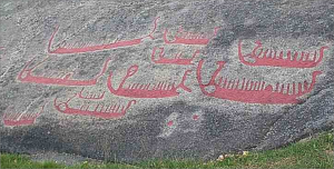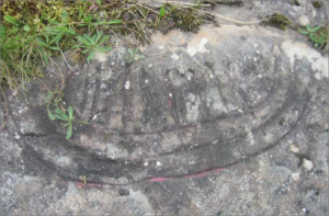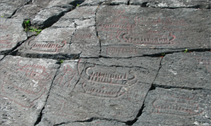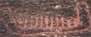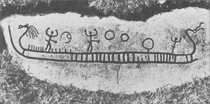 Bjørnstadskipet, et romersk skip med bordingslemmer for og akter. Ristningen måler ca 4×1,5 meter.
