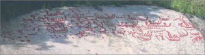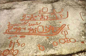 Helleristningen fra Solberg ved Skjeberg. Nederst til høyre liten barlind mellom en stor barlind og et solhjul der vi skimter noe av M i MA. Øverst til venstre Pytheas signatur Priamos Pytheas, pi pi. Skipene har phokeerske konturer, seiler mot venstre med rambukk i forstevnen. Stevnene går oppover og innover, og skipet har tilsynelatende to akterstevner. (Gihle Raddum)