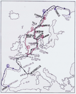 Pytheas reiseruter fra Massalia til Norge år 340 – 320 fvt., basert på Phyteas opplysninger og etter helleristninger av phokeiske skip og Massalias solhjul. Rød strek merket 1 er seilingsruten rundt Britannia. Blå strek merket 2 er ruten fra Gades til Tanais og Kvitsjøen. (SGR)