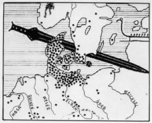 Kartet viser områder i Sør-Skandinavia hvor danenes greptungesverd – et enkelt og funksjonelt sverd beregnet på en menig kriger – er funnet. Det omfatter dagens Danmark sør til Elben og nordtyske områder øst til Oder samt Skåne. (Ill.: Etter Søren Nancke Krogh, dansk arkeolog og forfatter)