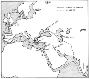 Danenes reiserute fra øst i Middelhavet til Sør-Skandinavia, etter S. Gihle Raddum (Norge under Roma 2019).